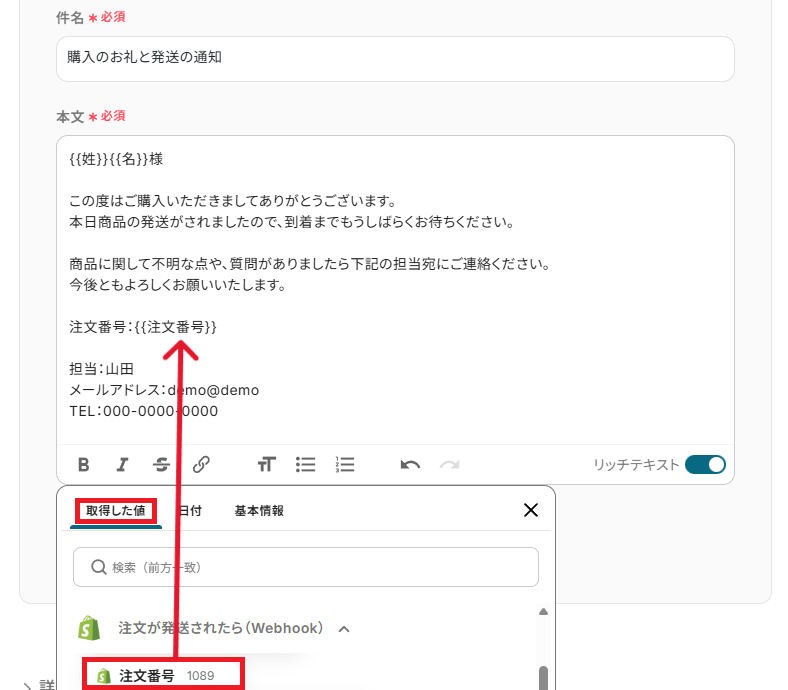 Gmailの「メールを送る」アクションでは、Shopifyのトリガーから取得した情報を変数として埋め込むことで、パーソナルな通知内容にカスタマイズできます。 ■注意事項