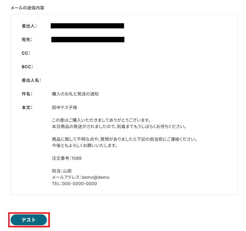 内容に誤りがないか確認し、問題なければ「テスト」を押してください。