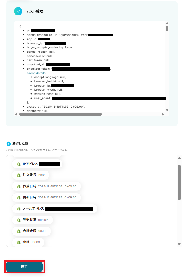 テストが成功すると、下記のような取得した値が表示されます。 取得した値はこのあとの設定でも使用します。