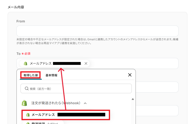 「To」は、取得した値を引用し、注文者のメールアドレスを設定しましょう。 取得した値を引用することで、トリガーが実行されるたびに最新の値が反映されます。 「CC」や「BCC」も任意で設定できます。