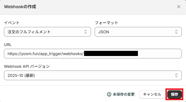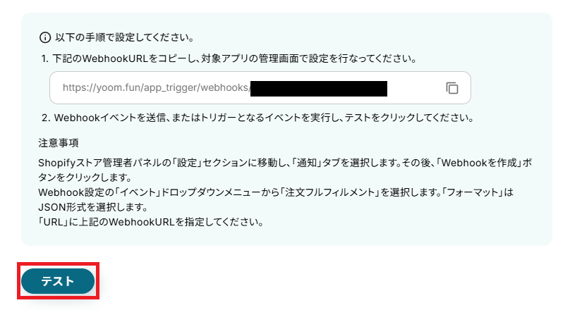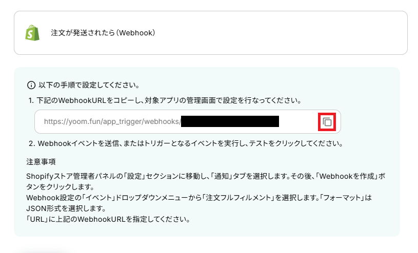 次に、Webhook設定を行います。 WebhookURLをコピーし、Shopifyの画面に移行しましょう。