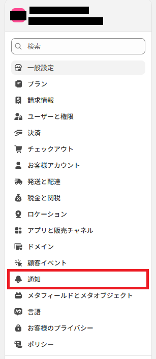 Shopifyの設定画面から「通知」タブをクリックしてください。