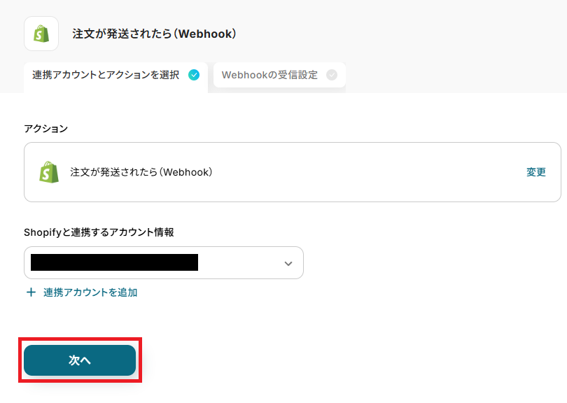 ステップ3:Shopifyのトリガー設定 ここからはフローボットの設定を進めていきます。 まず、「注文が発送されたら(Webhook)」をクリックしてください。