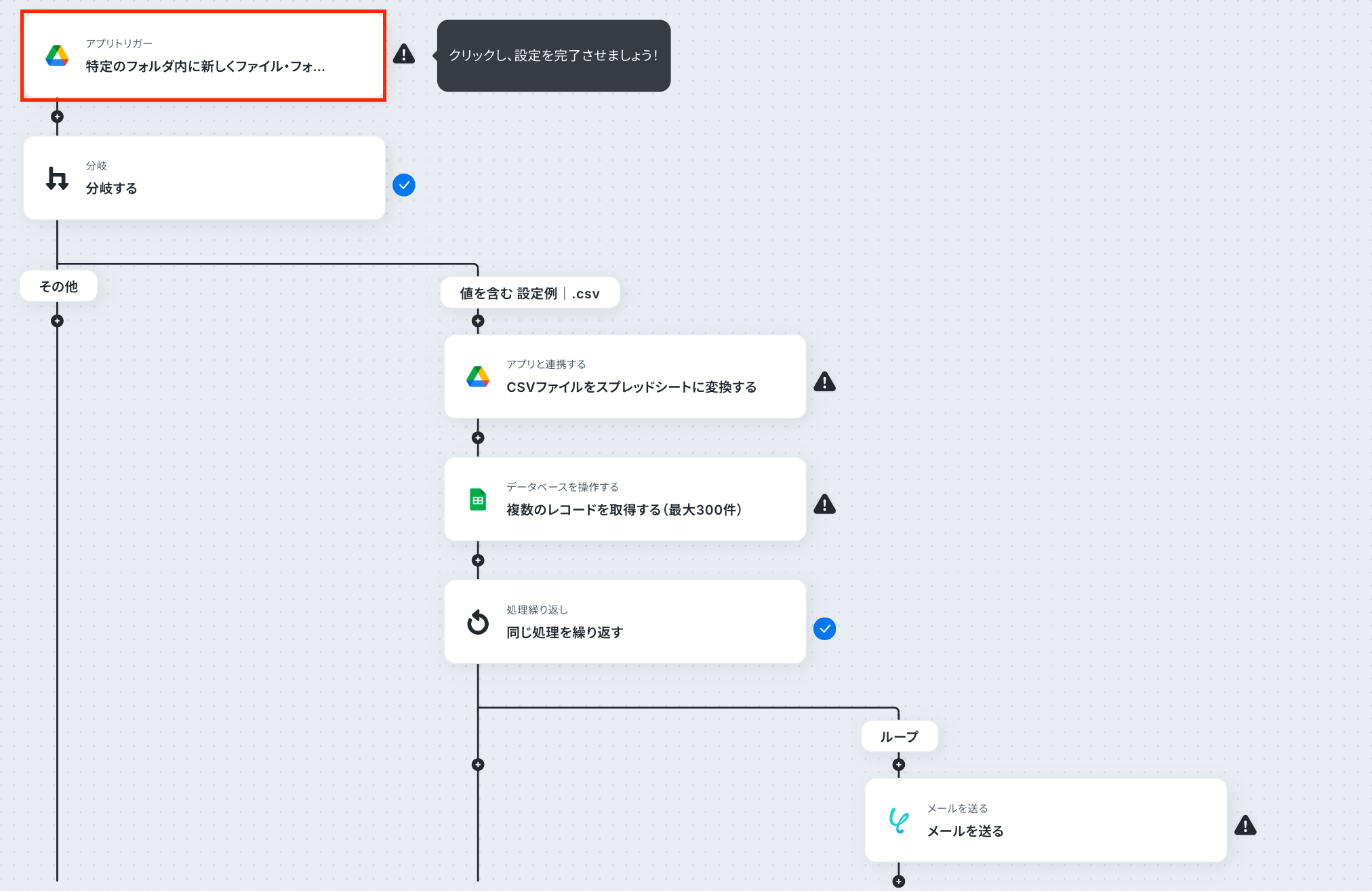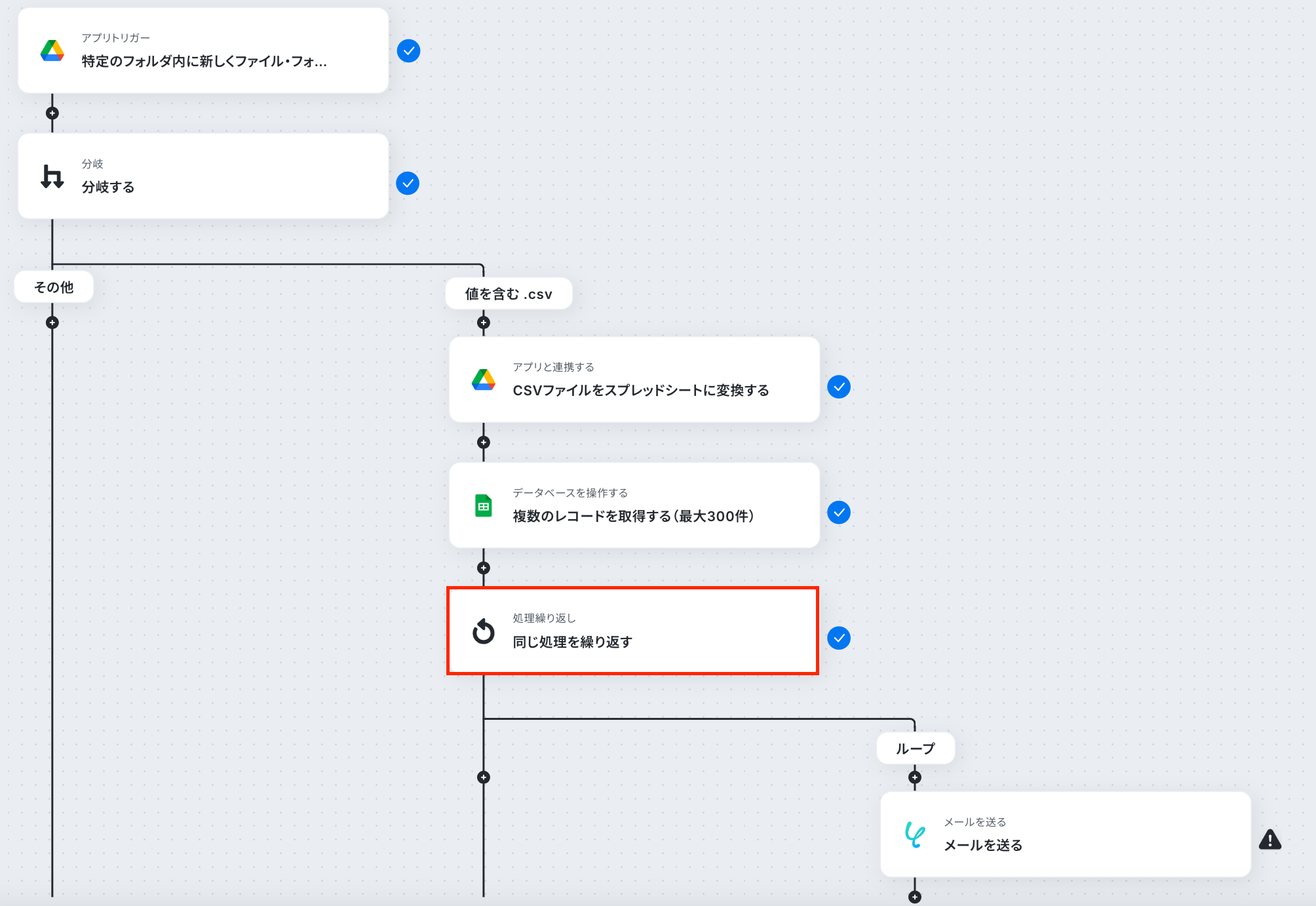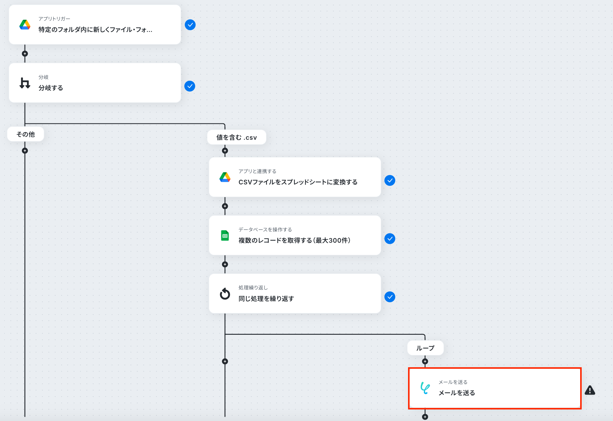 Google Driveのトリガー・「分岐する」オペレーション・Google Drive・Google スプレッドシート・「同じ処理を繰り返す」オペレーション・メール送信の設定