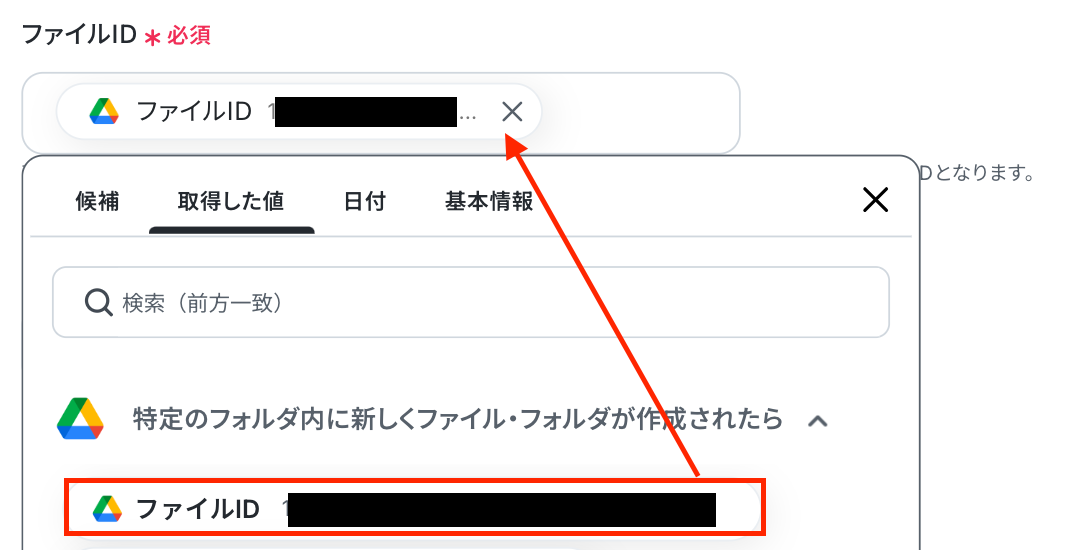 次の画面で必須項目を設定していきます! まずは、「ファイルID」を設定します。 下図のように、Google Driveの設定で取得した値を引用して設定してください。