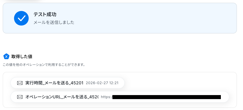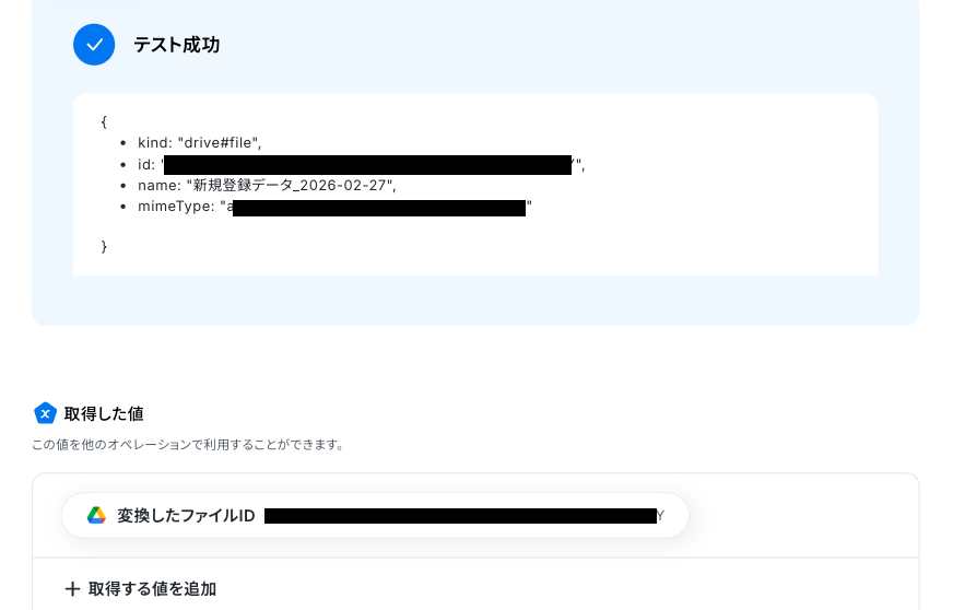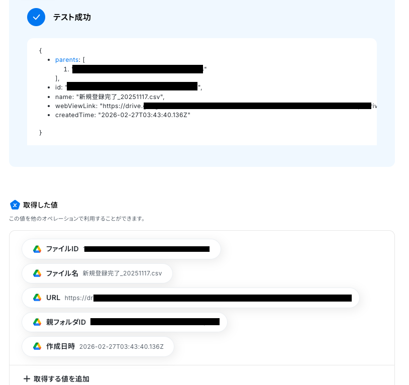「テスト」をクリックしましょう! テストが成功すると、取得した値が表示されます。※ 取得した値 とは? トリガーやオペレーション設定時に、「テスト」を実行して取得した値のことを指します。 後続のオペレーション設定時の値として利用でき、フローボットを起動する度に変動した値となります。