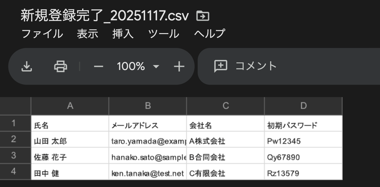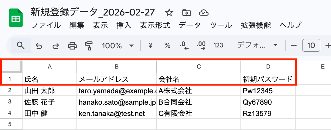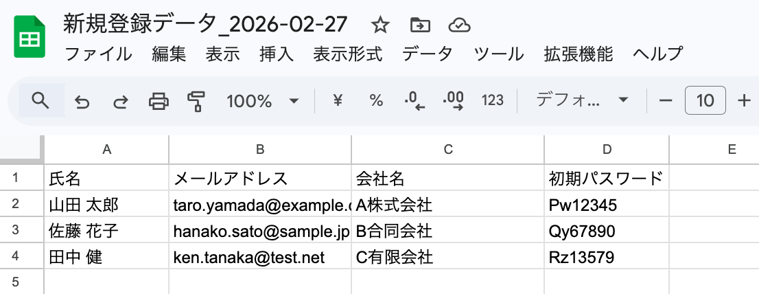 前準備:Google DriveでCSVファイルを用意する 本フローでは、「CSVファイルの情報をもとに複数名へ一斉にメールを送る」フローを構築します。 そのため、CSVファイルに「メールアドレス」・「会社名」・「氏名」・「初期パスワード」の情報を含んでいることを想定して、解説を進めていきます。