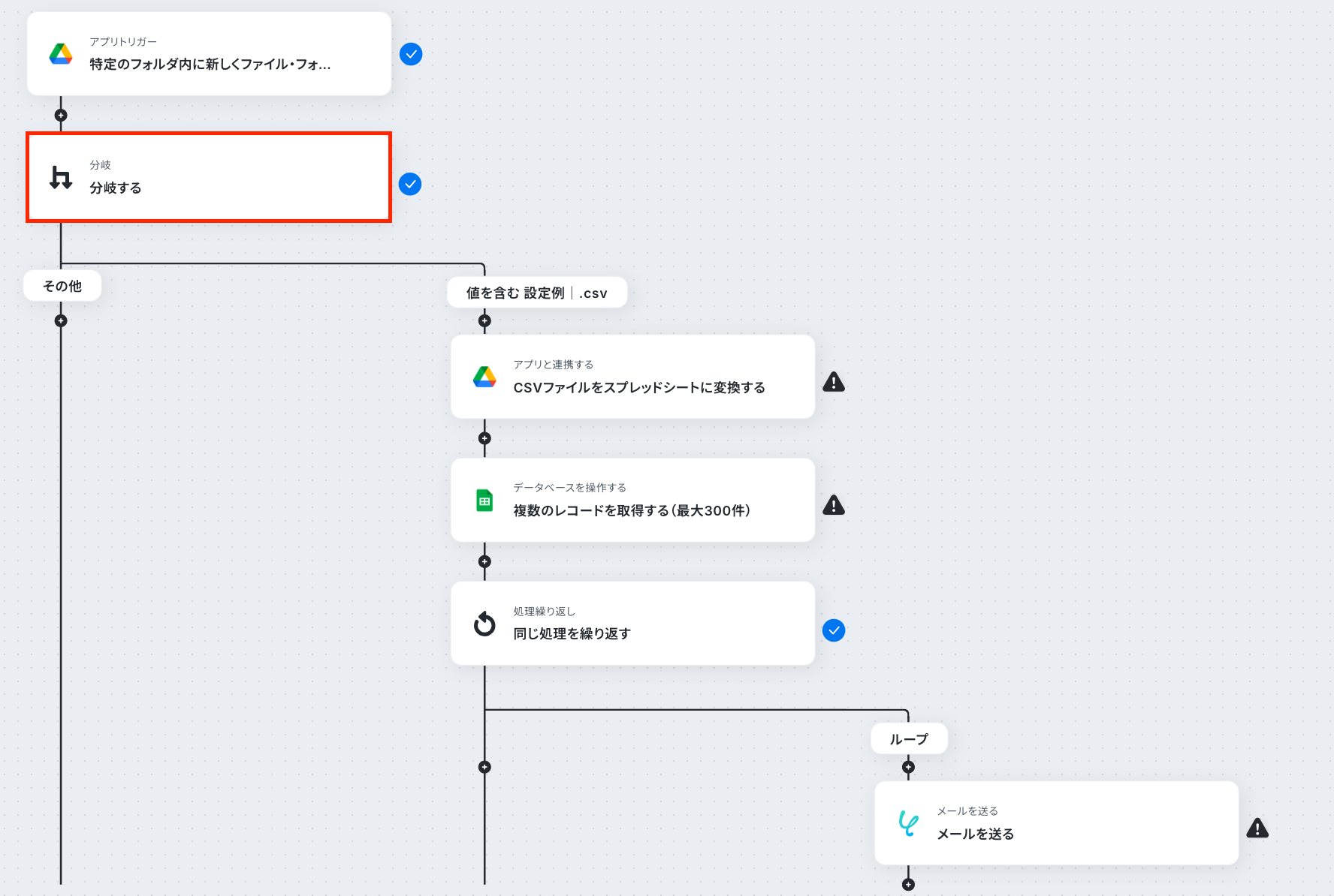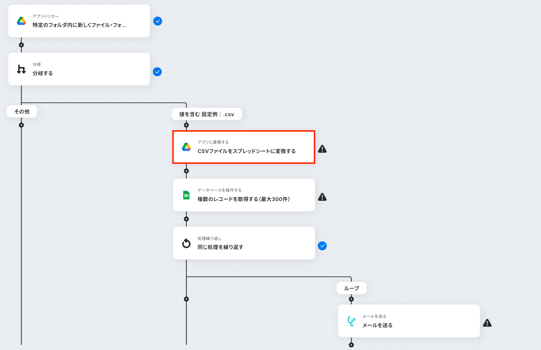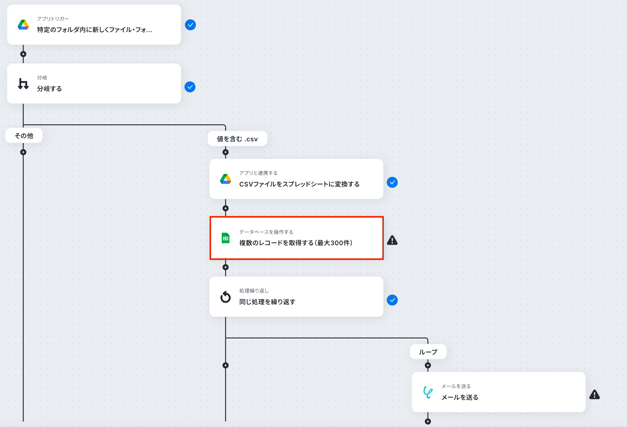 Google Driveのトリガー設定では、アップロードを検知する対象のフォルダを任意で指定することが可能です。 分岐機能では、ファイル名の拡張子や特定のキーワードが含まれる場合など、後続の処理に進むための条件を自由に設定できます。 CSVから変換したGoogle スプレッドシートから情報を取得する際、特定の条件に合致するデータのみを抽出するよう設定することも可能です。 メールの宛先には、Google スプレッドシートから取得したメールアドレスの情報を割り当てることができます。また、件名や本文にも取得した氏名などの情報を変数として埋め込み、パーソナライズされた内容にカスタムできます。 ■注意事項