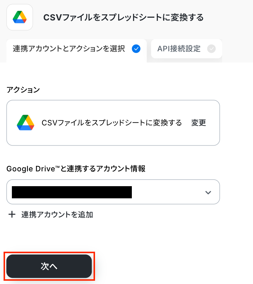 ステップ5:Google Driveのアクション設定 ここでは、CSVファイルをスプレッドシートに変換する設定を行います。 赤枠をクリックしましょう!