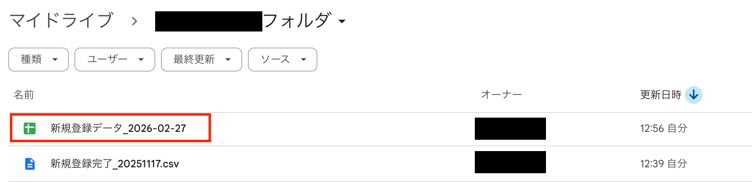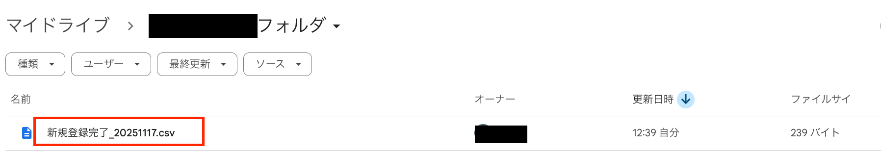 ここで、Google Driveの画面に移動し、ステップ2で用意したCSVファイルを任意のフォルダに作成・アップロードしてください。
