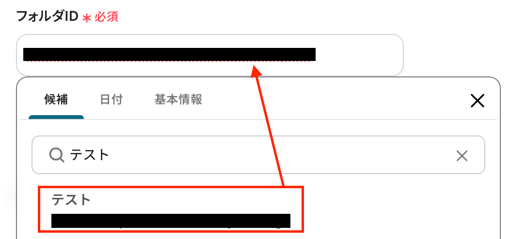 続いて、「フォルダID」 を設定します。 入力欄をクリックして表示される「候補」から選択してください。