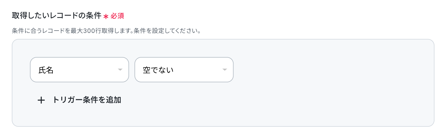 次に進むと、「取得したいレコードの条件」 を設定する画面に遷移します。 今回は「氏名」が「空でない」レコードを取得するように設定しました。 テストボタンをクリックしましょう!