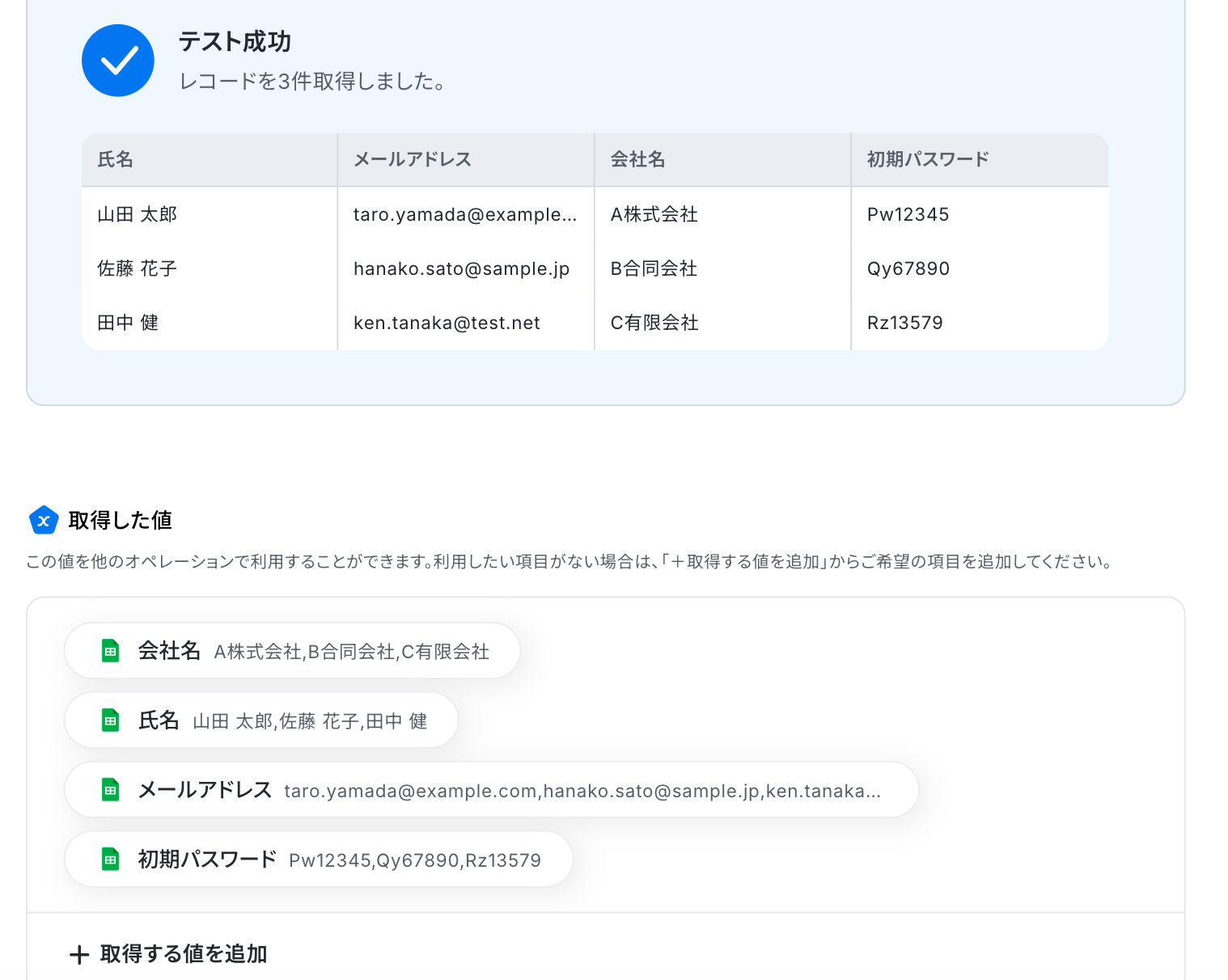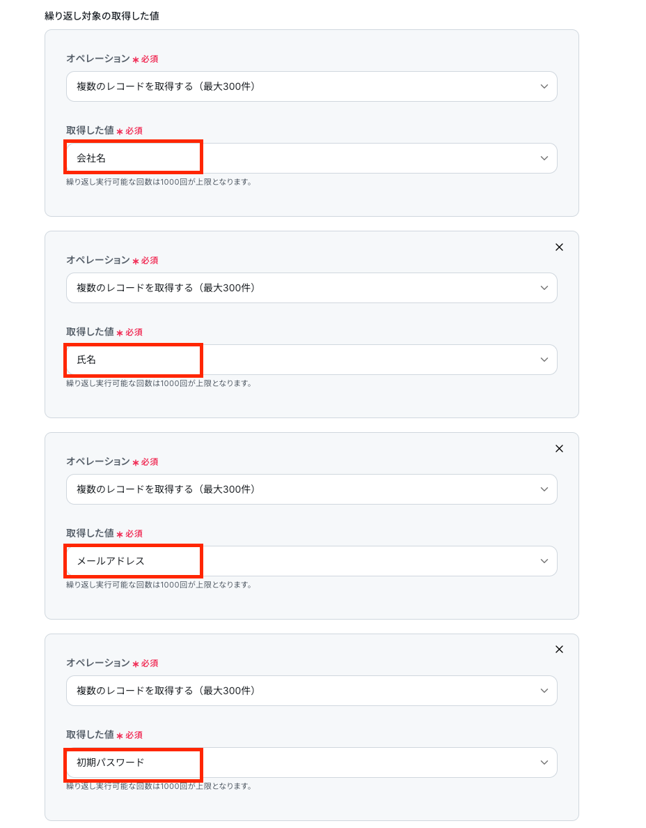 次の画面で、「繰り返し対象の取得した値」を設定します。 「オペレーション」は、「複数のレコードを取得する(300件)」 を選択してください。 「取得した値」は、先ほどのステップで取得した値を設定しましょう! ここでは「会社名・氏名・メールアドレス・初期パスワード」 を設定しました。 「完了」をクリックし、次のステップに進んでください!