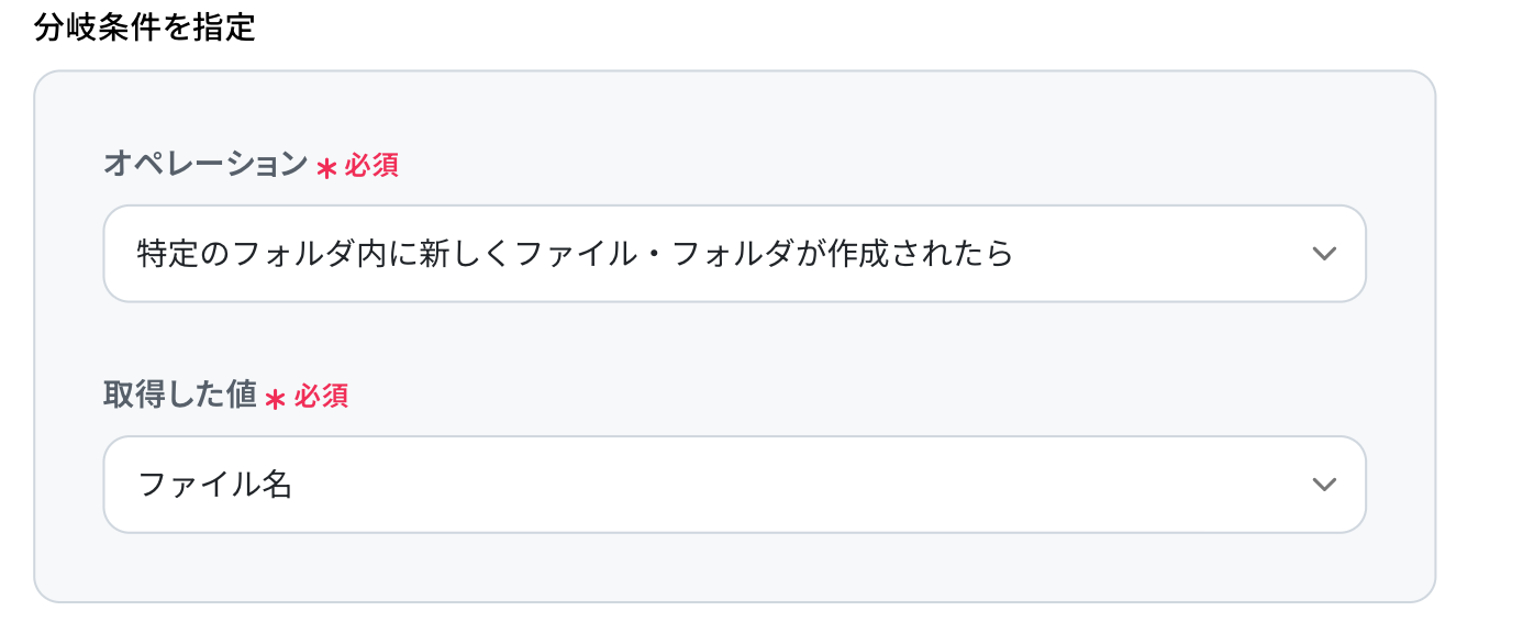 続いて、「分岐条件」を設定します。 ここで指定した条件に合致した場合のみ、後続のオペレーションへ進むことになります。