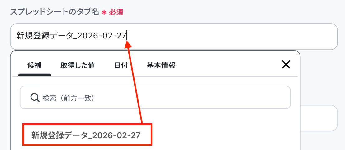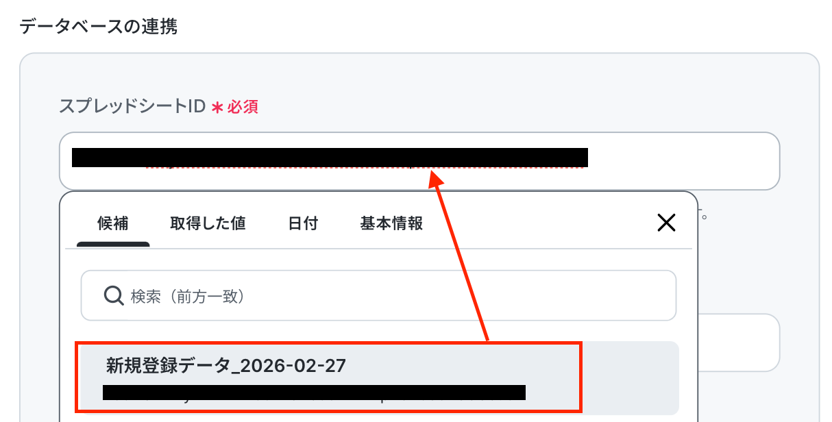スプレッドシートID とスプレッドシートのタブ名 を設定します。 入力欄をクリックして表示される「候補」から、ステップ5で作成したシートを選択しましょう。