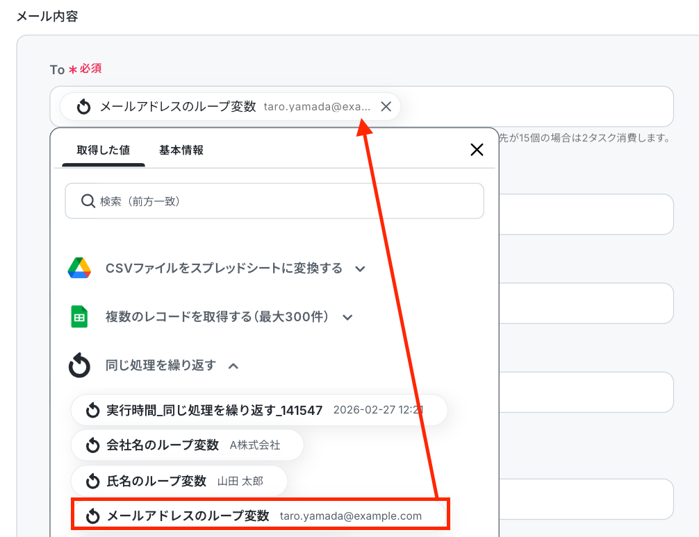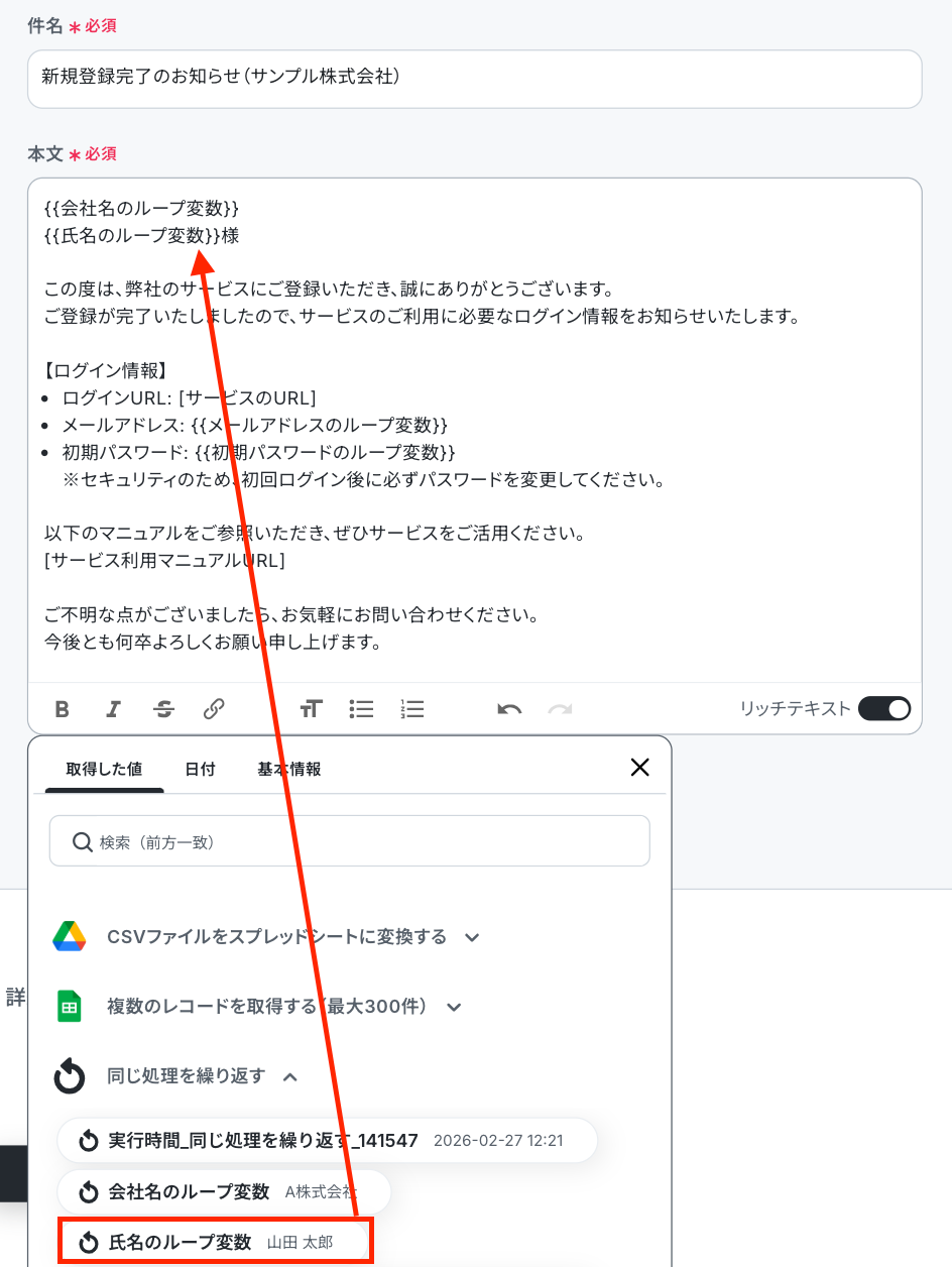 「件名」 と「本文」 は、自由に設定しましょう。 ここでは、任意で作成した文章と繰り返し処理のオペレーションで取得した値を組み合わせて設定しました。
