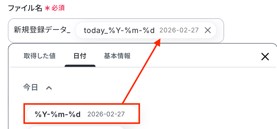「ファイル名」は、自由に設定しましょう。 ここでは、日付変数を使用して設定しています。