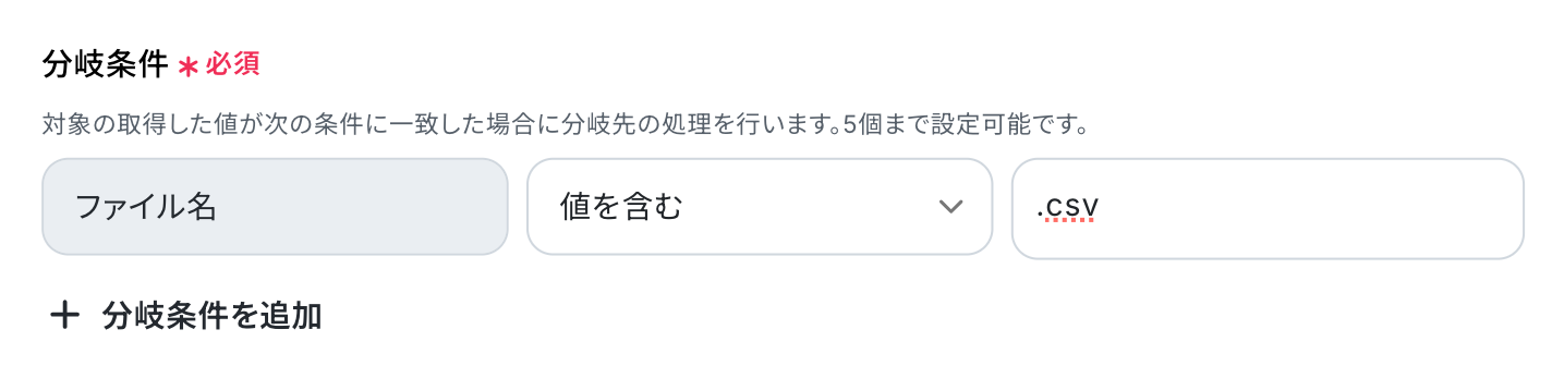 今回は、「ファイル名」に「.csv」の値を含む場合に、次のオペレーションへ進むように設定しました。
