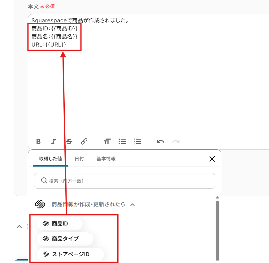 「本文」は、入力欄をクリックして表示される取得した値から選択してください。