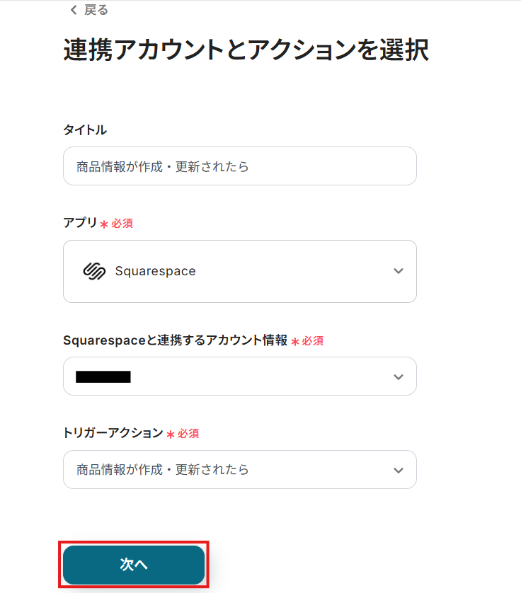 連携するアカウント情報には、ステップ1で連携したアカウント情報が反映されています。トリガーアクションはそのままにして、「次へ」をクリックしてください。