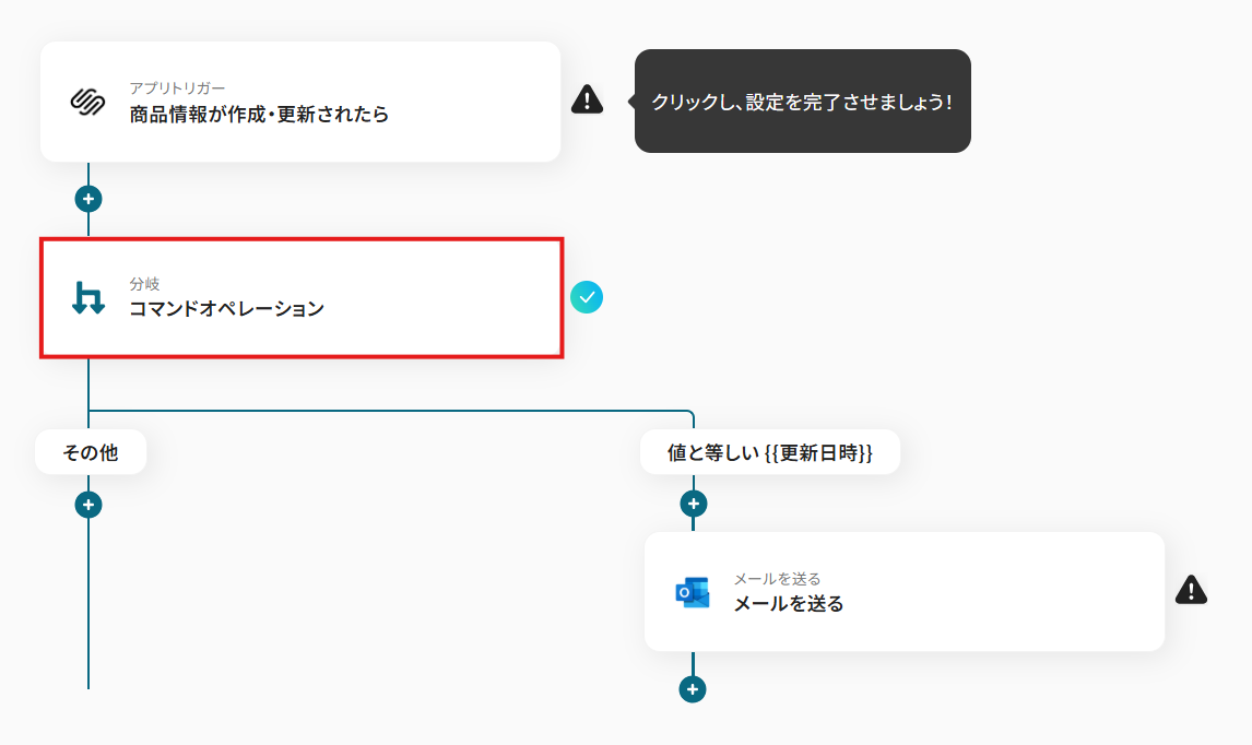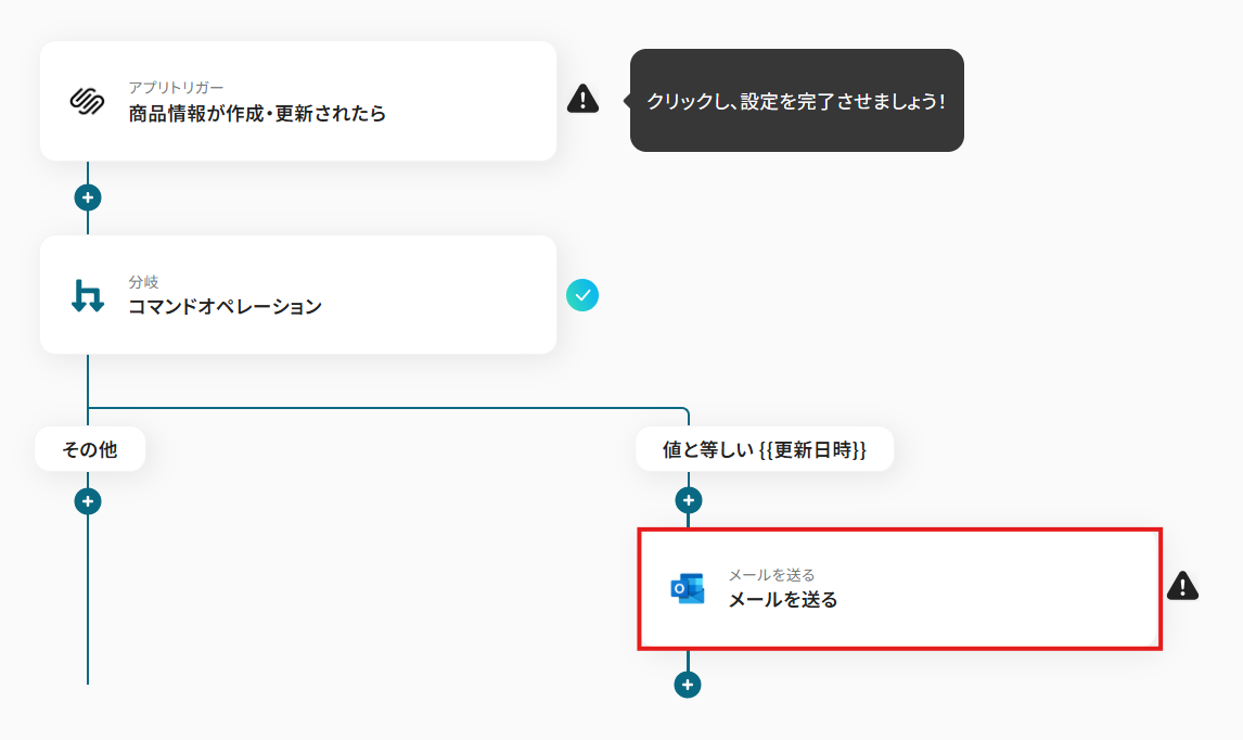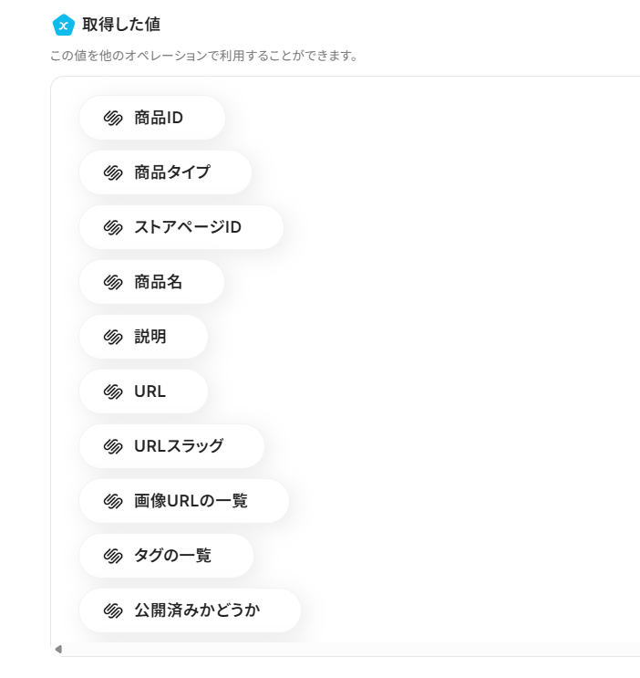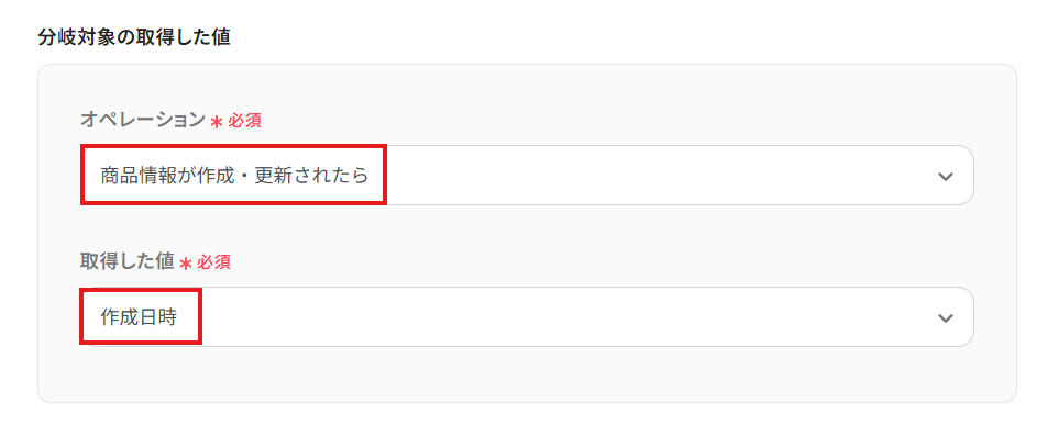 オペレーションに「商品情報が作成・更新されたら」、取得した値に検知したい項目を設定します。