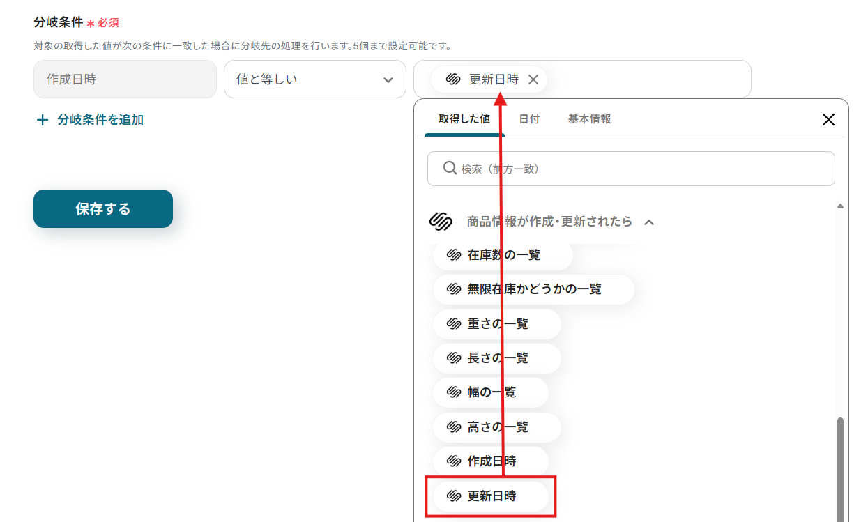 「分岐」設定の分岐対象の取得した値「取得した値」の検知したい項目を設定する際に、商品に関する値を設定し、「分岐条件」で、特定の条件を設定することができます。