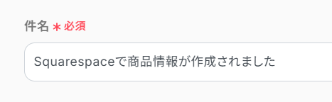 ※固定値で設定すると、毎回同じ内容が通知されてしまいます。今回の「Squarespaceで商品が作成されました。」などの文は固定値で設定しても大丈夫ですが、それ以外は、取得した値を設定するようにしましょう。
