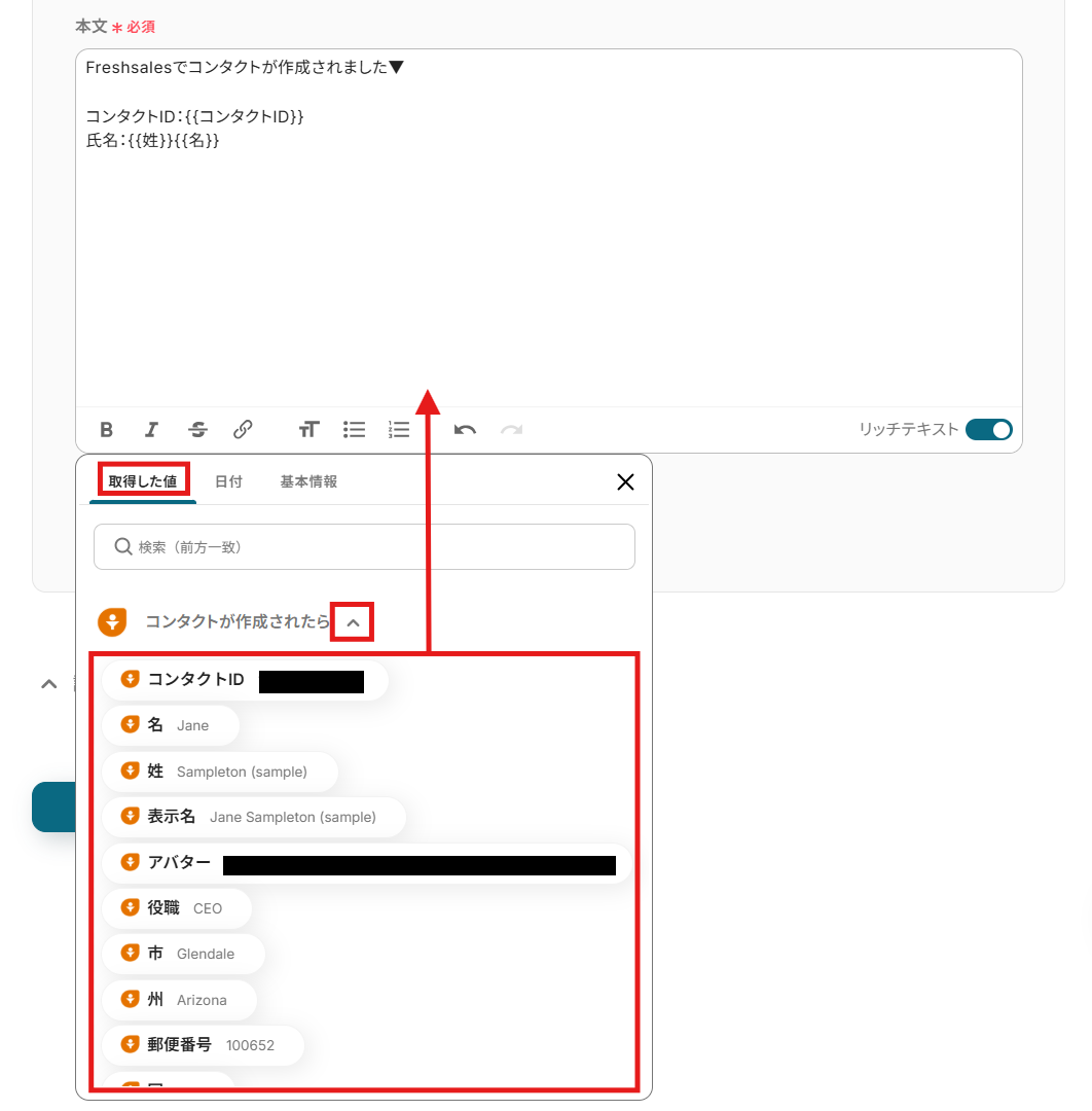 - 本文や件名などに、Freshsalesから取得した値を利用できます。