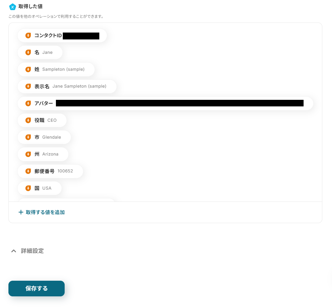 テストが成功したら、Freshsalesから取得した値が表示されるので確認してから、保存します。