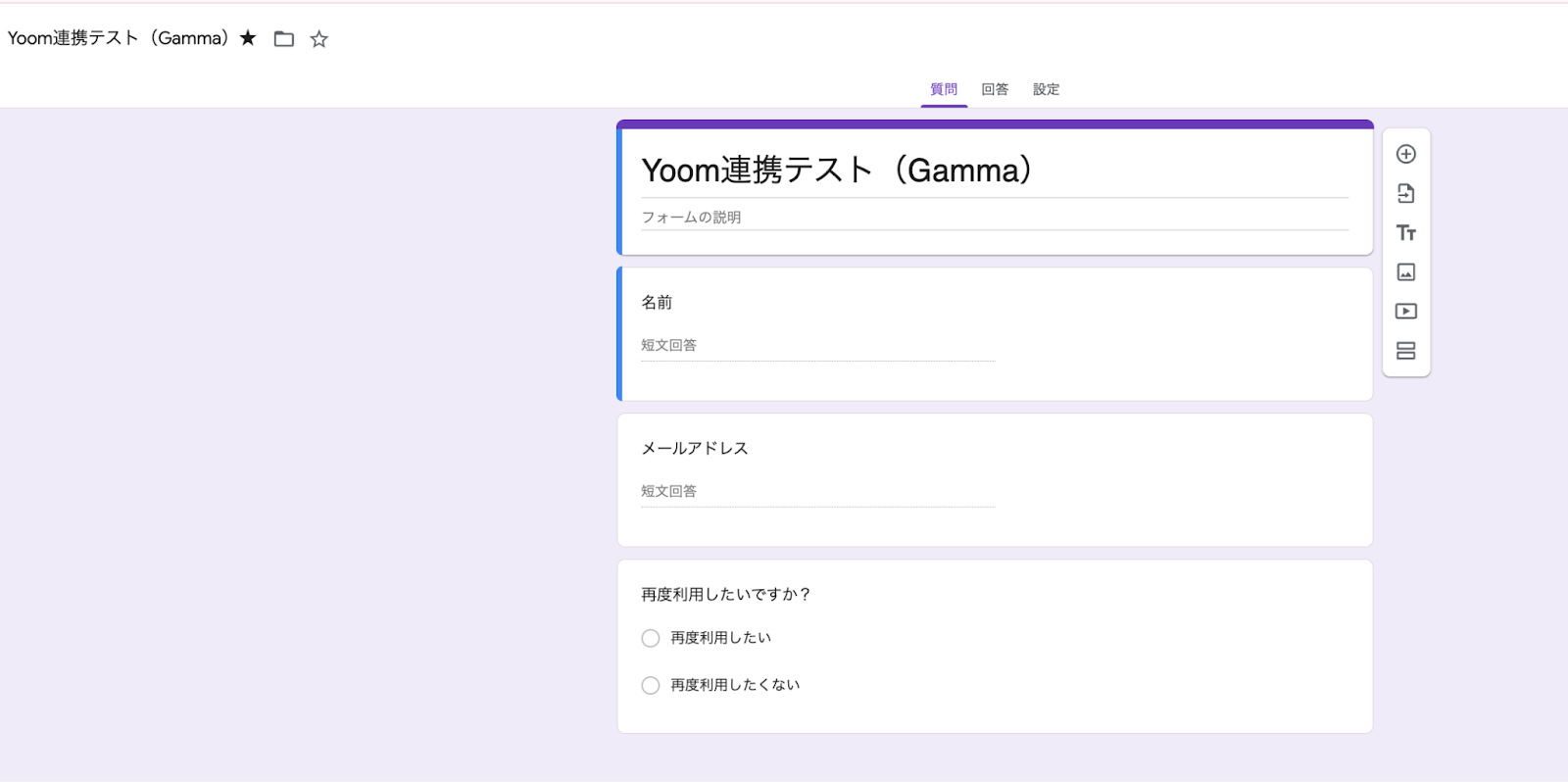 まずは、連携したいGoogleフォームを作成します。 今回はテスト用に下の画像のフォームを準備しました!