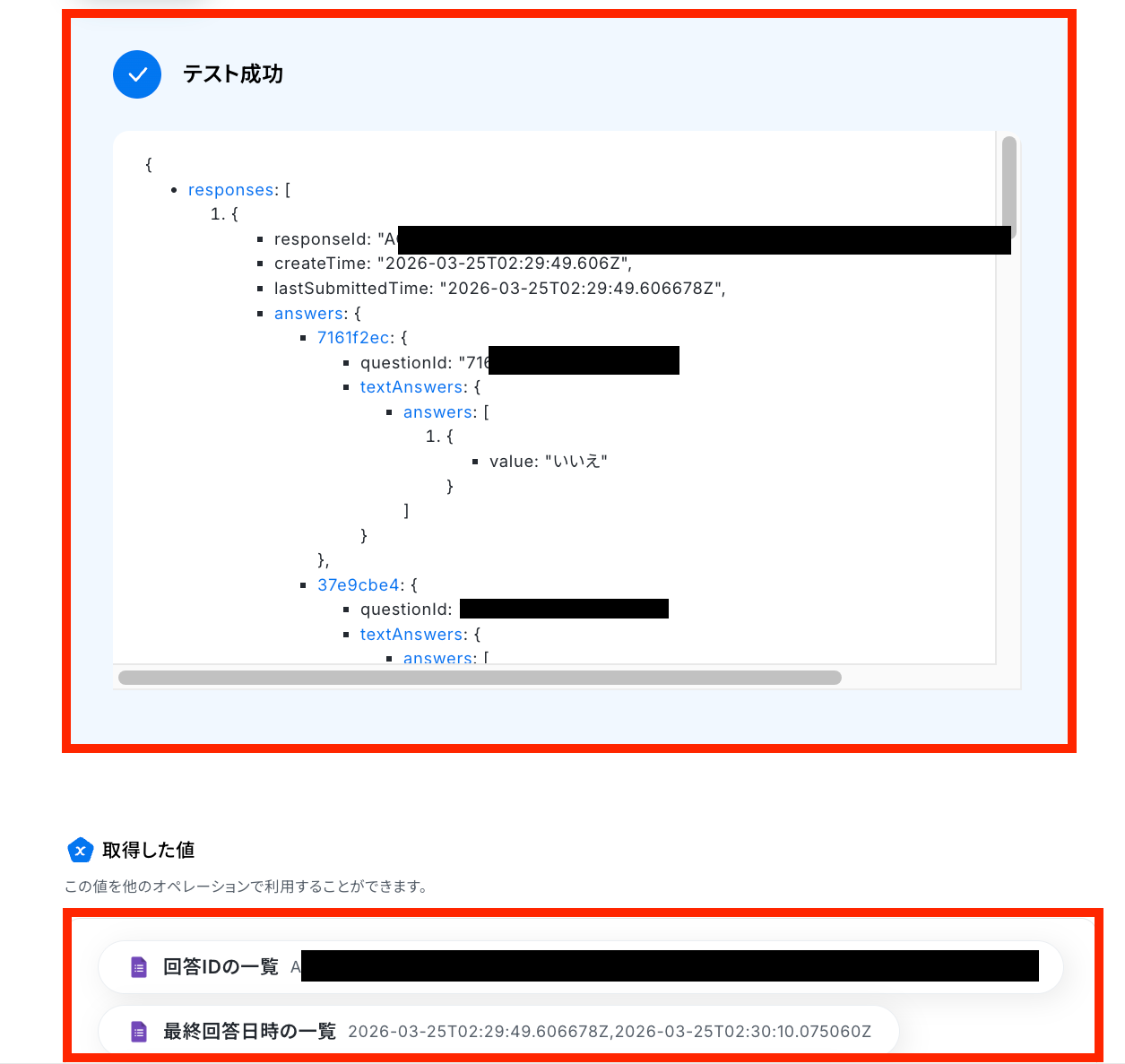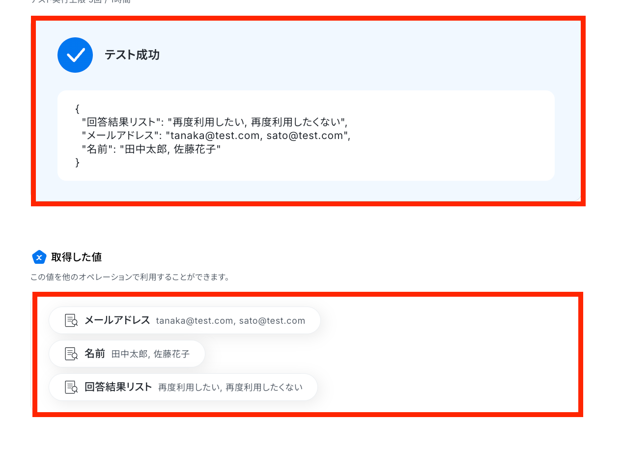 テストに成功すると、Googleフォームのデータが「取得した値(※)」の欄に反映されます。 ※取得した値 とは? トリガーやオペレーション設定時に「テスト」を実行して取得した値のことです。 後続のオペレーション設定時の値として利用でき、フローボットを起動する度に変動した値になります。
