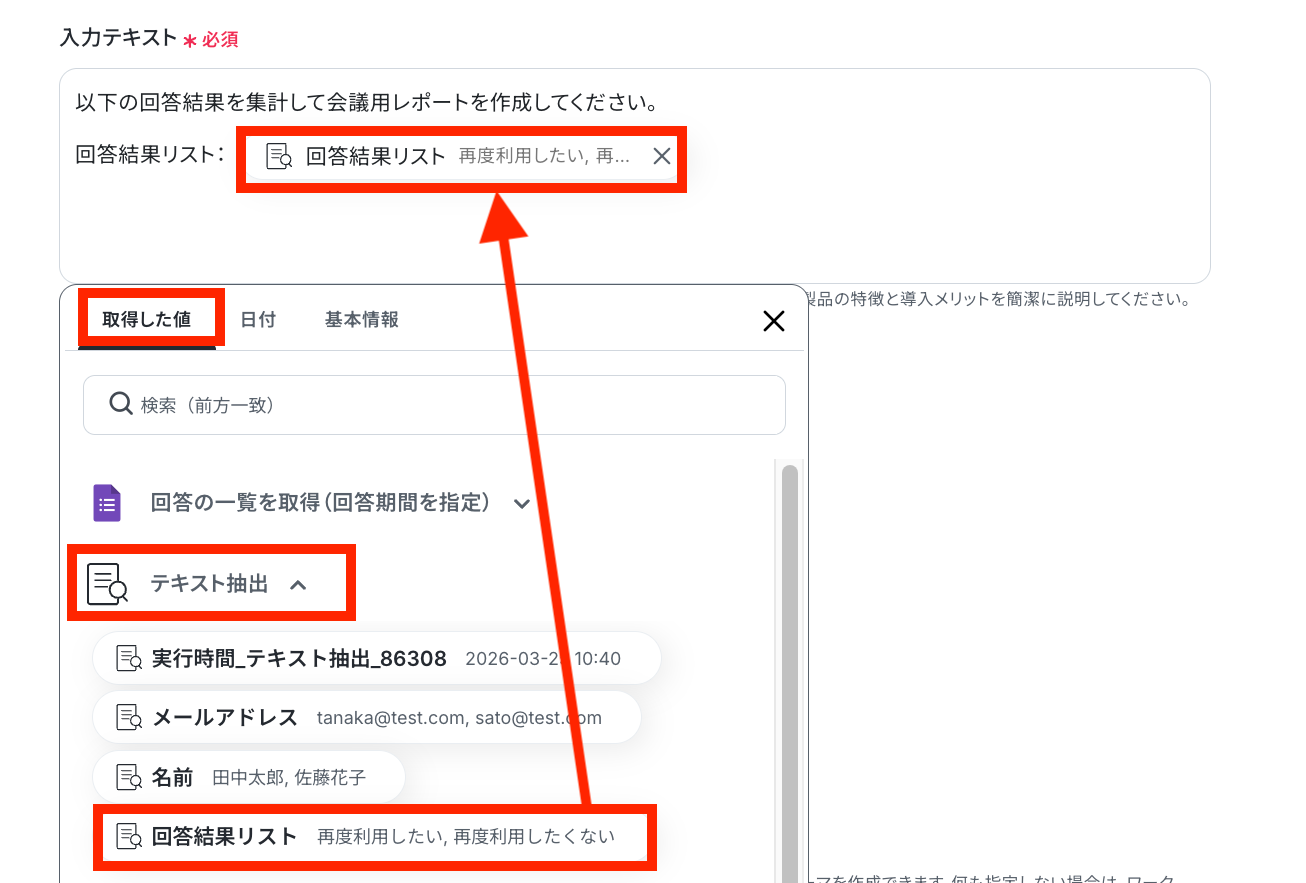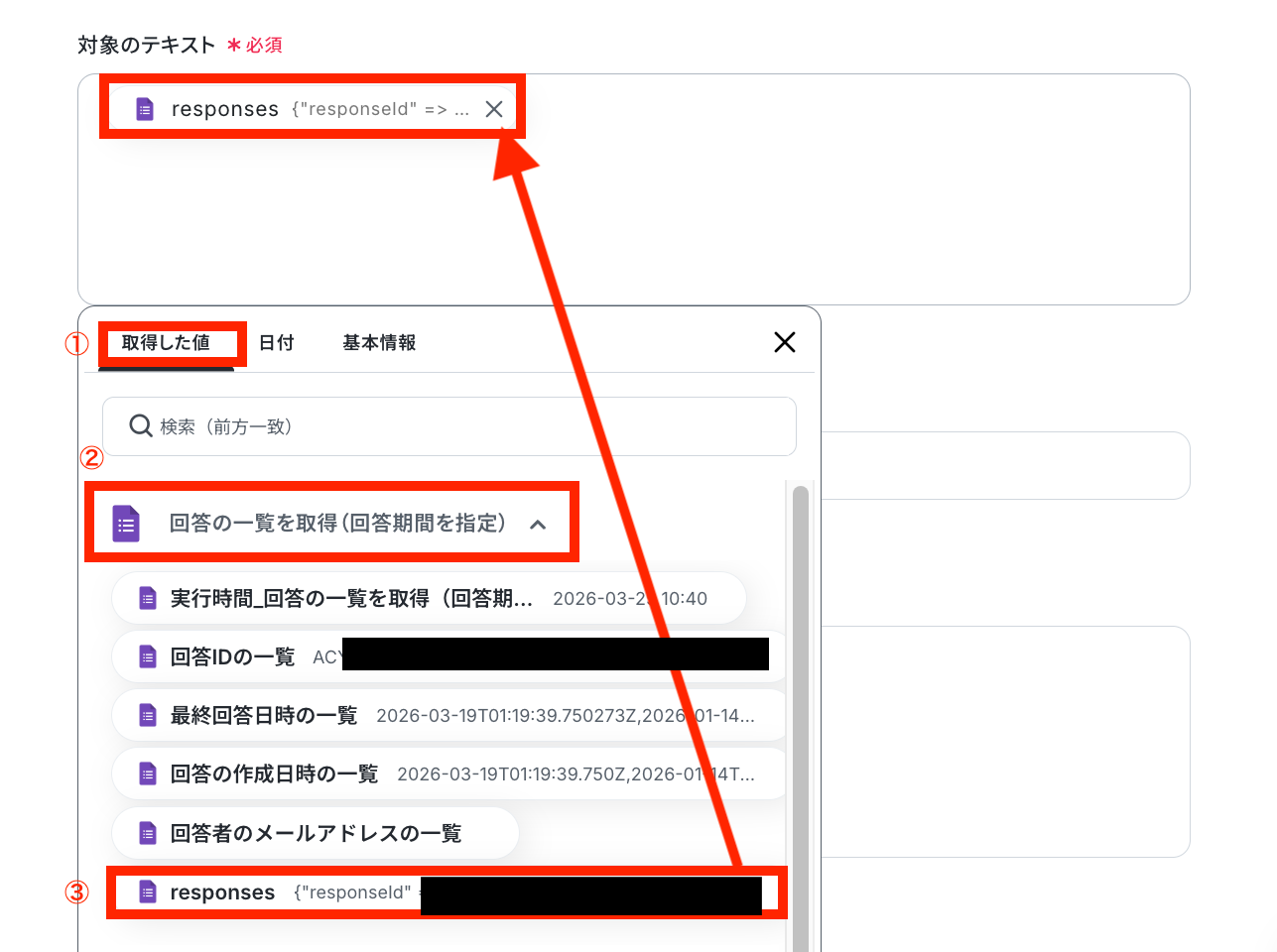 【取得した値を埋め込む方法】 ①入力欄をクリックして「取得した値」を表示 ②「回答の一覧を取得(回答期間を指定)」をクリック ③「responses」を選択