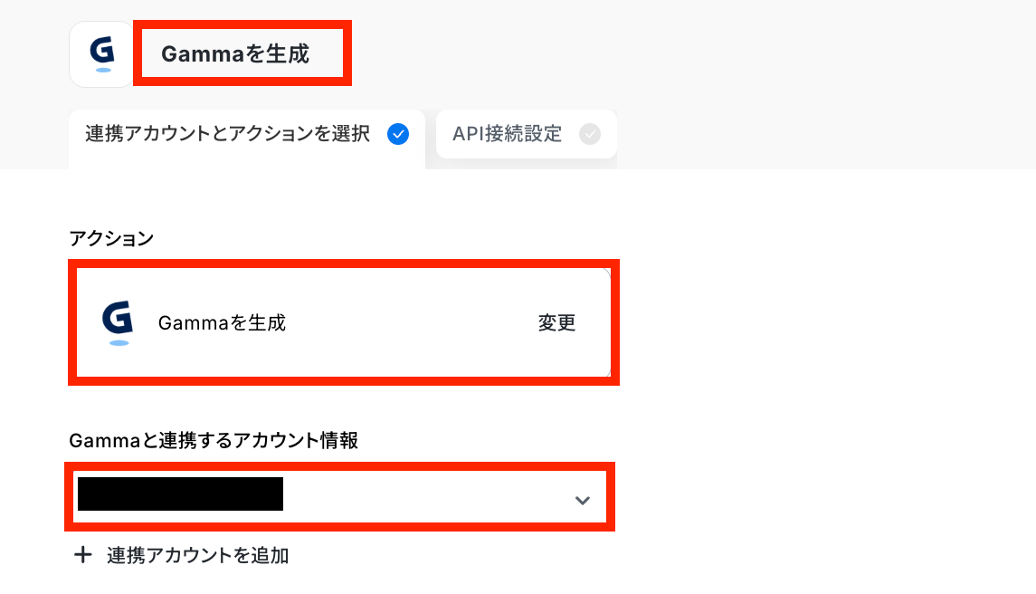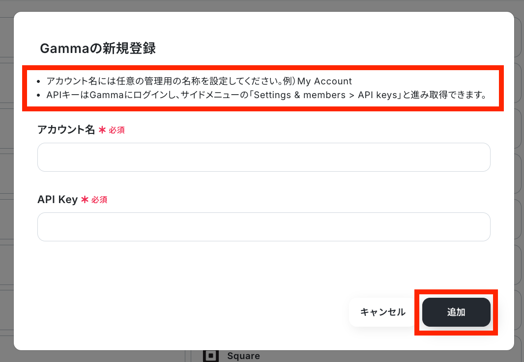 GammaとYoomの連携方法 Gammaを検索すると、新規登録画面が表示されるので「アカウント名」と「API Key」を下の画像の赤枠の説明文を参考に設定してください。 最後に「追加」をクリックしたら連携完了です!