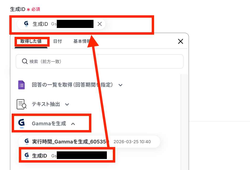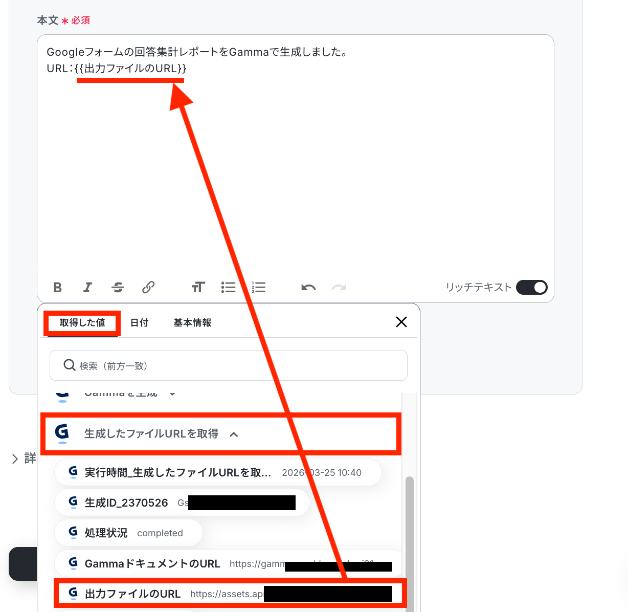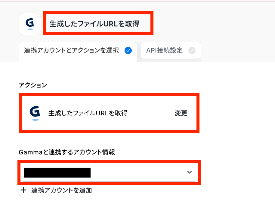 ステップ8:Gammaの生成ファイルのURL取得設定 該当するアクションを開く