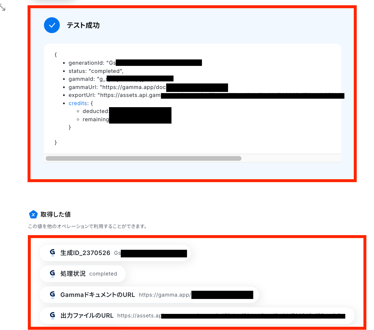 テストに成功したら実際にレポートが作成されているかGammaを確認しましょう。 確認できたらYoomの画面に戻って「完了」をクリックします。