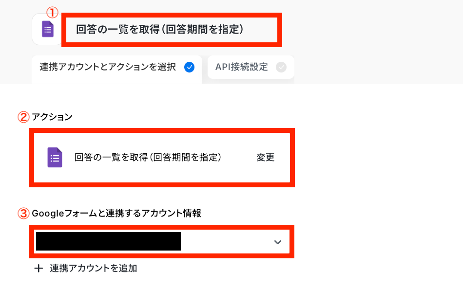 ②アクション:デフォルトで「回答の一覧を取得(回答期間を指定)」が選択されているのでそのままで問題ありません! ③Googleフォームと連携するアカウント情報:ステップ1で連携したアカウントが表示されていることを確認しましょう。