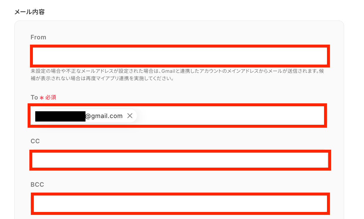 「To」は任意の送信先を設定してください。 他の「From」や「CC」などは任意項目なので、必要に応じて設定しましょう。