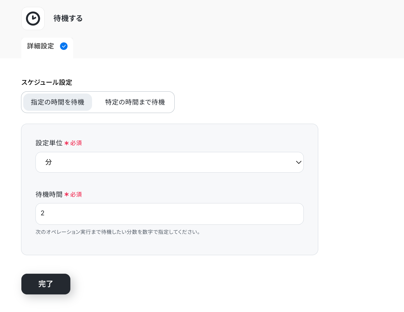 デフォルトで「2分待機」する設定になっているので、そのままで問題なければ次のステップに進みましょう! ※「待機する」オペレーションは、チームプラン・サクセスプランでのみ 利用可能な機能です。フリープラン・ミニプランの場合は設定しているフローボットのオペレーションやデータコネクトはエラーとなるので、ご注意ください。