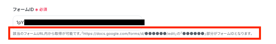 それでは「フォームID」を設定します。 注釈を参考にGoogleフォームIDをURLからコピーして貼り付けてください。