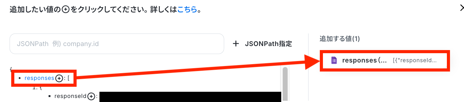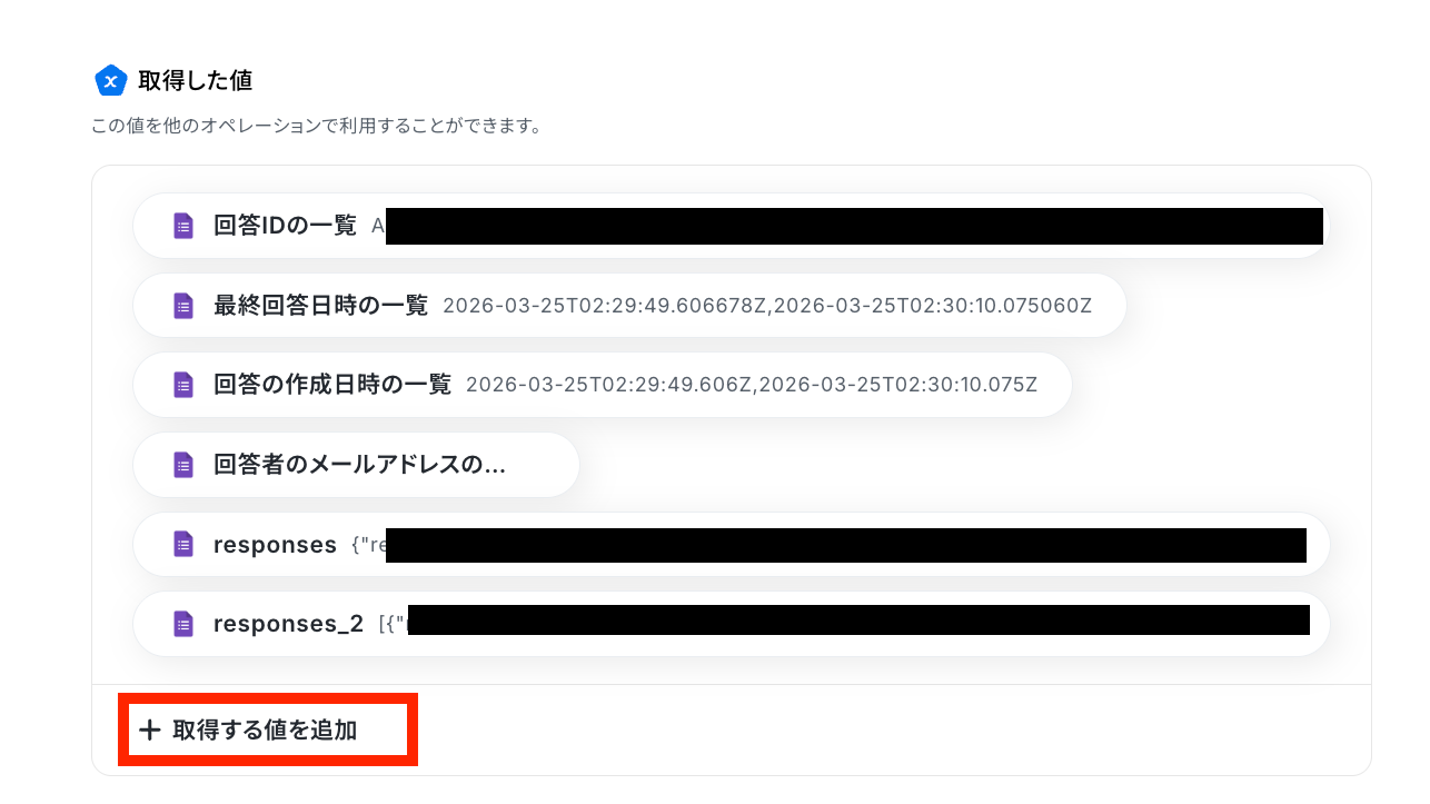 今回は「responeses」という項目のデータを使用したいので、もし回答一覧を確認して反映されていない場合は、「取得した値」の一番下にある「+取得する値を追加」をクリックして追加をしましょう。 詳しくは「取得する値」を追加する方法 をご確認ください。