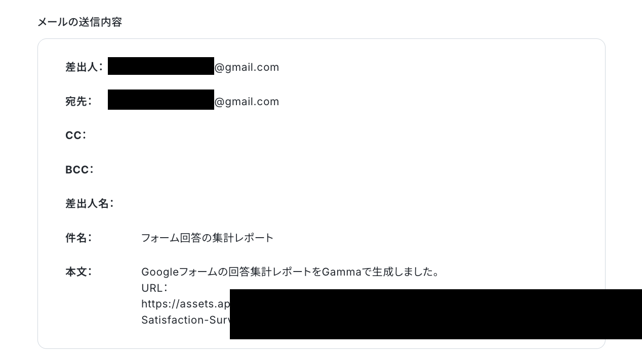 以上が、定期的にGammaでフォーム回答の集計レポートを生成してGmailで送付する連携手順になります。