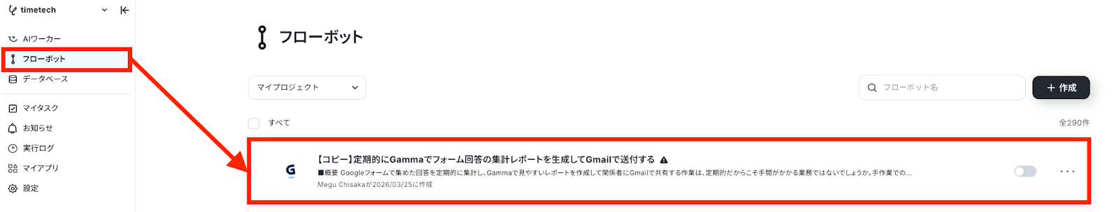 ステップ3:スケジュールトリガーの設定 左側にあるメニューの「フローボット」から、コピーしたテンプレートを開きます。 (※テンプレートをコピー後、すぐに設定する場合はテンプレートを開く操作は不要です。設定を中断した場合のみ「フローボット」から設定作業を再開してください!)
