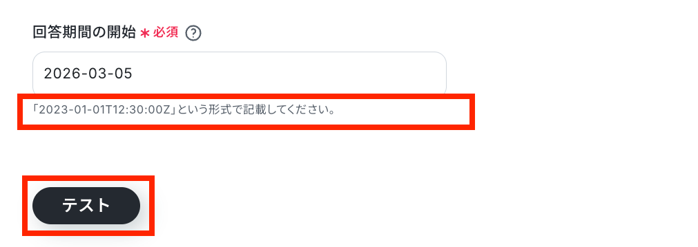 次に「回答期間の開始」を設定します。 注釈を参考に設定してください!(今回は2026年3月5日を設定しています。)