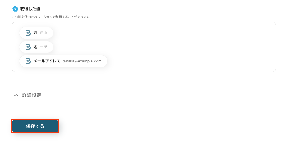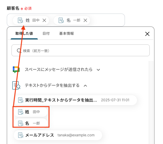 対象のテキストから抽出したい項目をカンマ区切りで入力してください。今回はboardに顧客を登録するため、「姓、名」と「メールアドレス」の各項目を対象テキストから抽出する設定にしました。