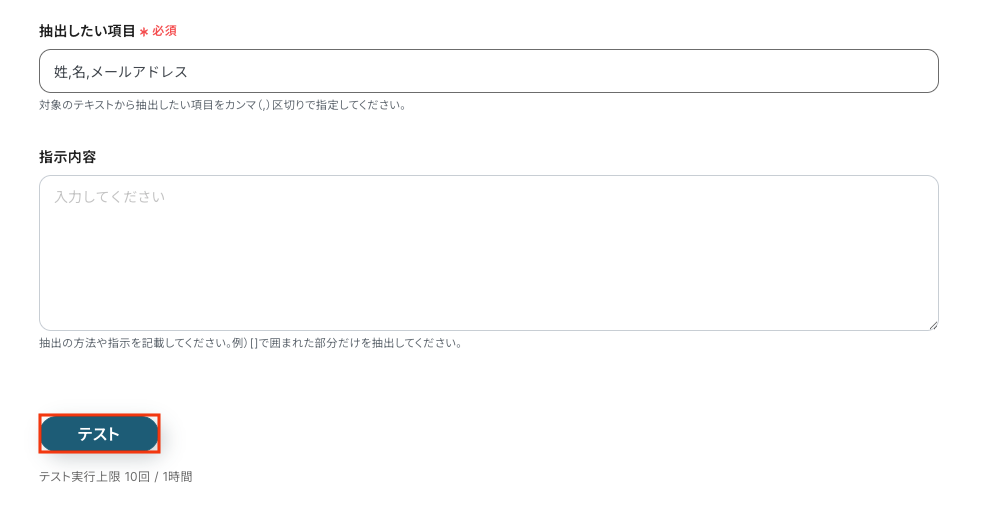 また、AIへの指示内容は任意で設定可能です。どのようにテキストを解析・抽出してほしいかを伝える指示を入力しましょう。