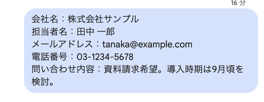投稿されたメッセージから必要な情報を抽出し、boardに顧客として自動登録されるかを確認するため、今回は以下の内容をテスト用に投稿しました。