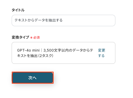変換タイプ(GPT-4o mini|3,500文字以内のデータからテキストを抽出(2タスク))がデフォルトで設定されているので、文字数やタスク数に応じて変更し「次へ」をクリックします。