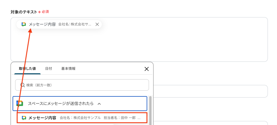 例えば、Google Chatのメッセージをもとにboardの顧客情報を自動で作成したり、特定の条件に合致する情報のみを連携させたりと、柔軟な設定ができます。