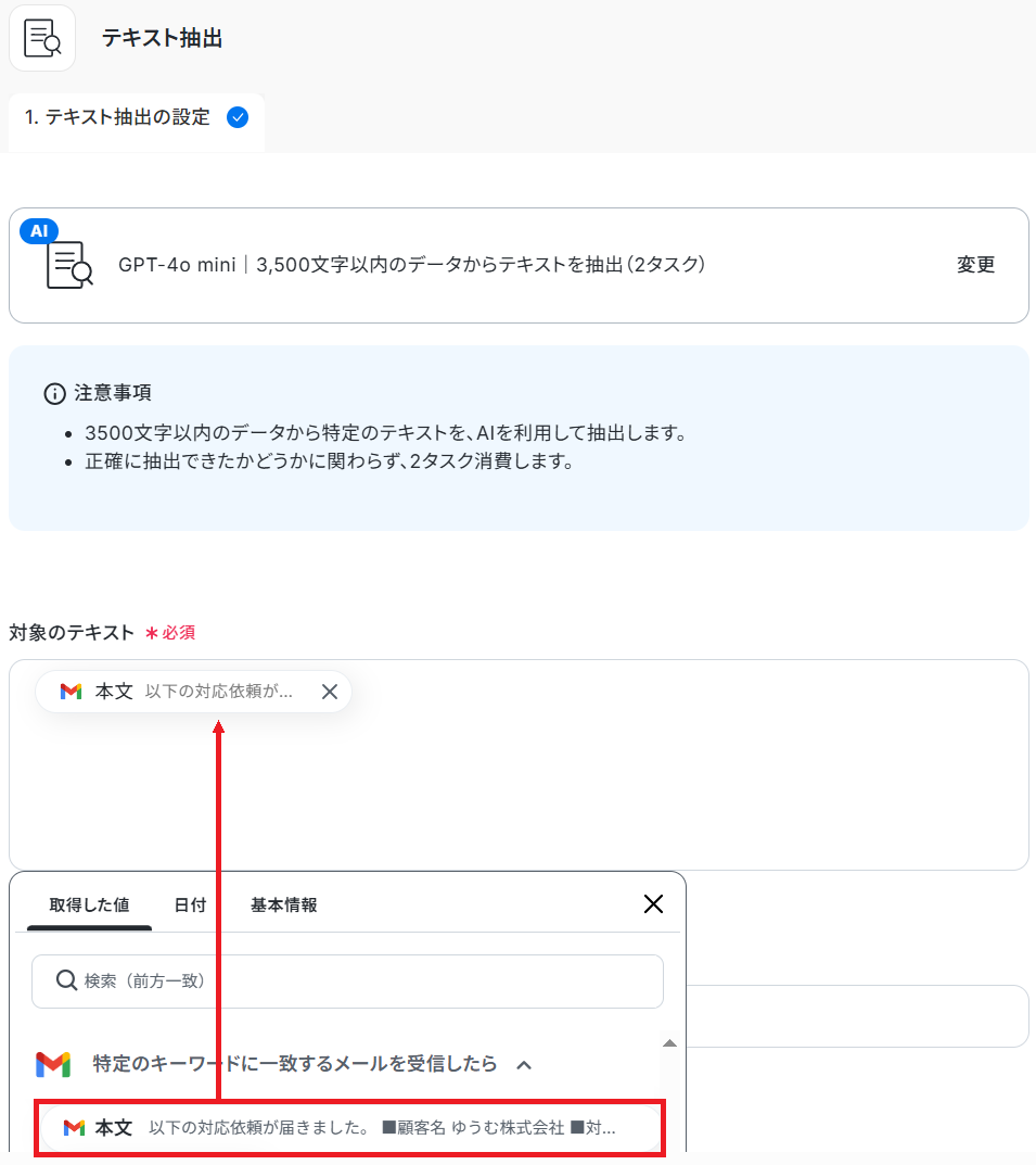 対象のテキスト の欄には、Gmailから取得した「本文」の値が予め設定されているのでそのままで大丈夫です。