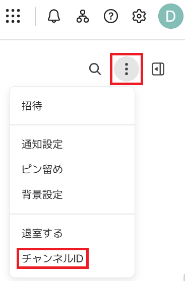 ※トークルーム画面右端に以下のようなメニューがあるので「チャンネルID」をクリックしてください。